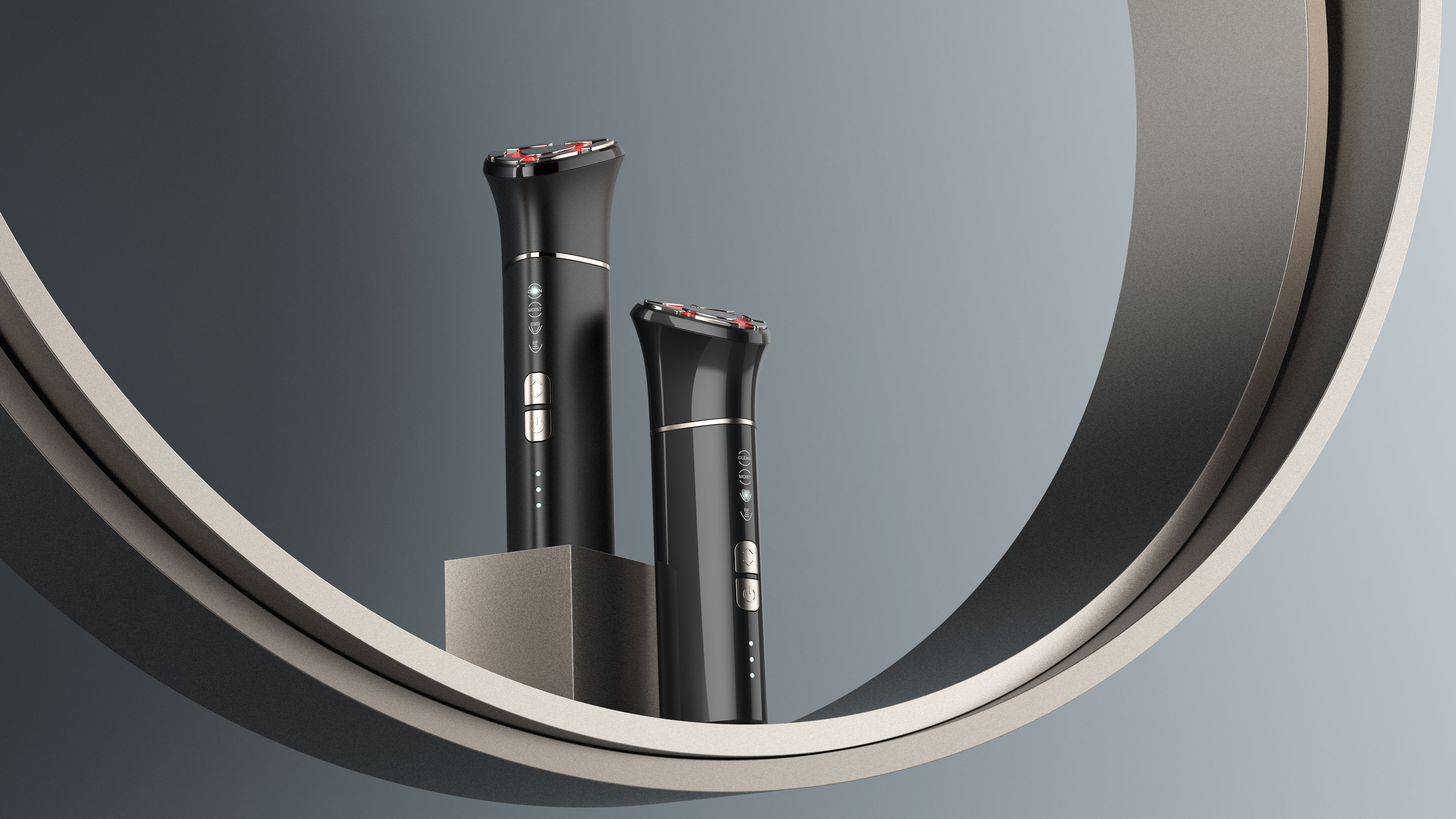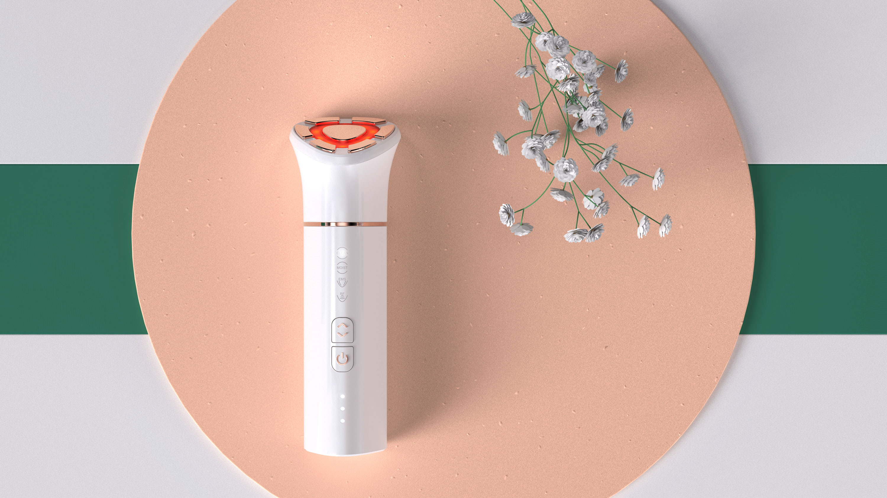 設(shè)計整體采用幾何構(gòu)成,握持舒適.頭部是三角形特征.符合當(dāng)下簡約設(shè)計風(fēng)格.采用雙頻紅藍(lán)光兩種光源,有助于改善熬夜,淡印提亮,讓肌膚重回年輕活力.